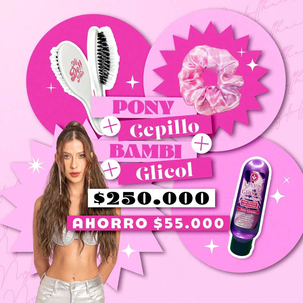 Este combo de ponytail y productos de cuidado es perfecto para mantener tu ponytail hermoso y saludable. Incluye un cepillo suave para peinar sin tirar del cabello, un bambi para dar volumen y un glicol para mantener la hidratación y brillo. ¡El combo completo para tu ponytail perfecta!
