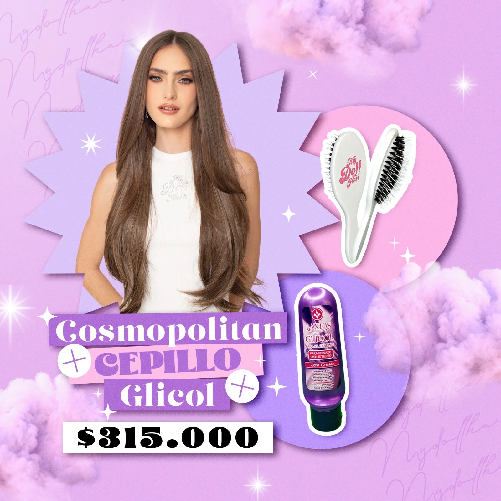 Que tus extensiones sean suaves y brillen tanto como tu! con ayuda de nuestro combo, glicol + extensiones lisas de punta elevada y Doll Brush para hacerte lucir más radiante con cada look